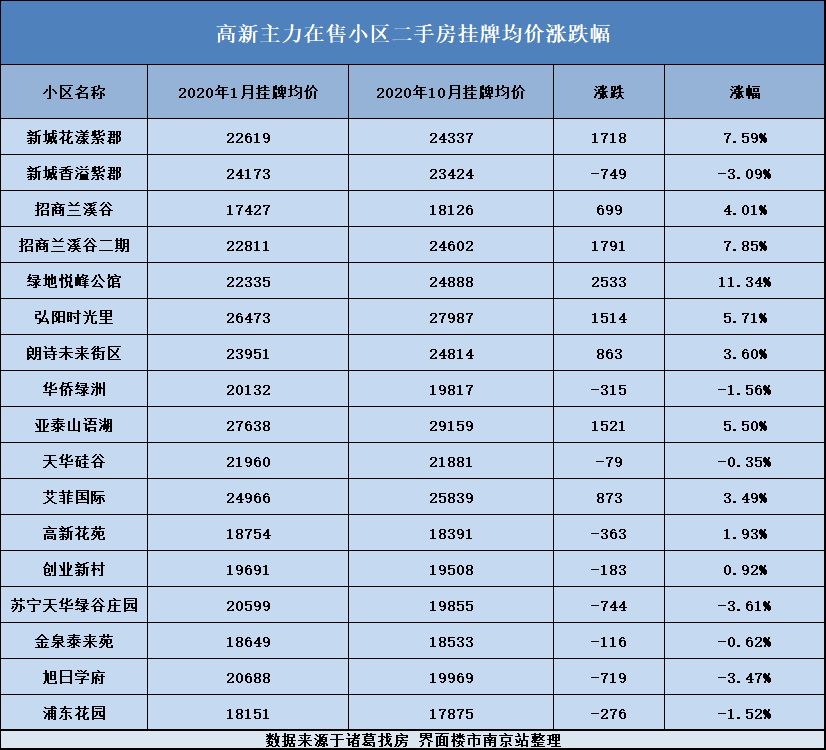 通过界面楼市南京站综合统计,依据诸葛找房的数据,从1月到10月,高新17个主力在售小区中,7个小区挂牌价下跌,10个小区二手房挂牌均价上涨,涨幅最高达11.34%,跌幅最高达3.61%。