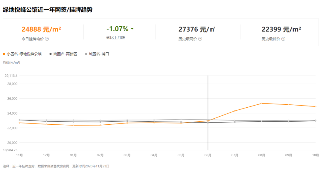 位于涨幅榜第一名的绿地悦峰公馆,自1月份的22335元/㎡,一路上涨到10月份的24888元/㎡,上涨了2533元/㎡,涨幅高达11.34%,目前小区在售房源180套。