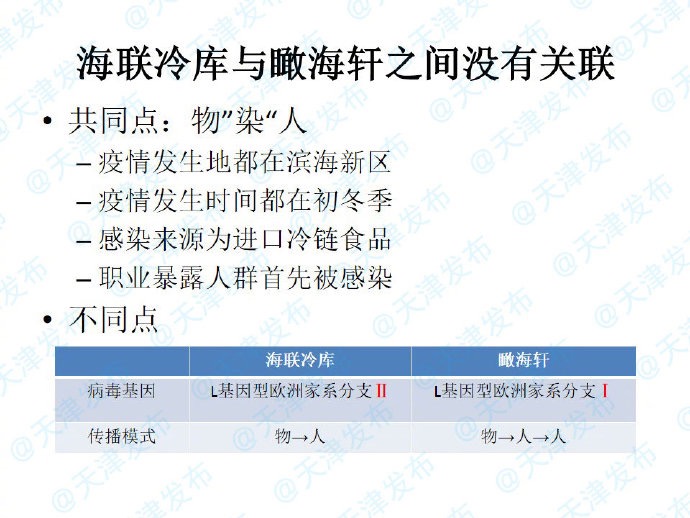 海联冷库经过粗测序,它的病毒基因属于是L基因型欧洲家系2分支,瞰海轩属于L基因型欧洲家系1分支,它们的上缘是一样的,就像家庭一样,是兄弟两个人是不同的两个分支,从基因测序上可以判断这两起疫情是完全没有关联性的。