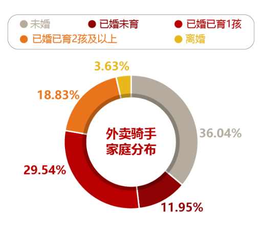 新京报的调研报告显示,在外卖骑手的家庭情况上,超六成的外卖骑手已经成家立业,结婚有一孩占比达到29.54%,结婚有两孩及以上占比为18.83%,结婚未育占比为11.95%。《新蓝领就业与生活状况研究报告》又指出,75.1%的新蓝领人群的收入在家庭总收入中占比超过40%,46.4%的新蓝领人群的收入在家庭总收入中占比超过60% 。