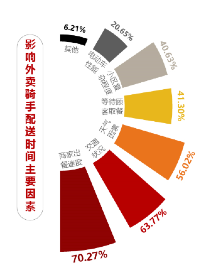 在扛起家庭重任的同时,骑手们也都在努力工作,而配送时间成为他们较为关注的问题,据新京报骑手调研报告数据显示,70.27%的外卖骑手认为商家出餐速度是影响配送时间的主要因素,占比最高。