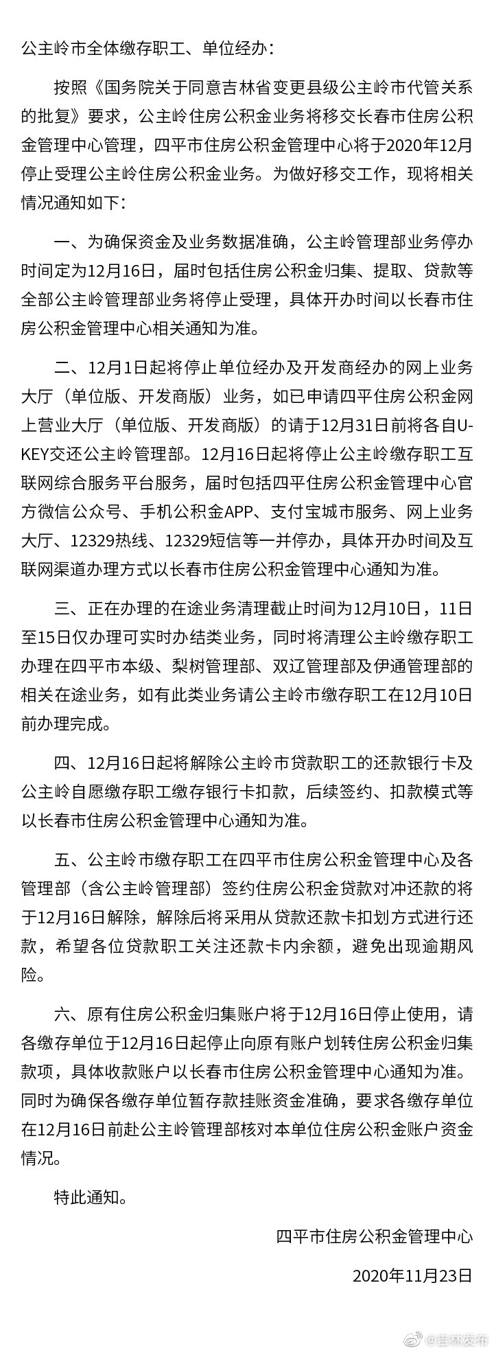 据吉林四平市住房公积金管理中心网站23日消息,按照《国务院关于同意吉林省变更县级公主岭市代管关系的批复》要求,公主岭住房公积金业务将移交长春市住房公积金管理中心管理,四平市住房公积金管理中心将于2020年12月停止受理公主岭住房公积金业务。