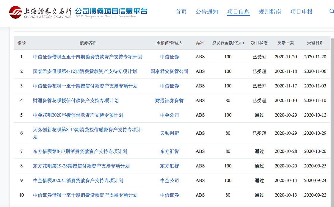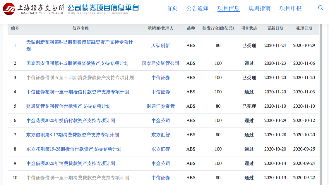 11月24日晚间,界面新闻记者查询上交所公司债券项目信息平台公告发现,有200亿花呗借呗相关ABS 融资项目获上交所批准放行,分别是11月6日受理的《国泰君安借呗第4-12期消费贷款资产支持专项计划》、11月3日受理的《中信证券花呗一至十期授信付款资产支持专项计划》,涉及的融资金额均为100亿元。