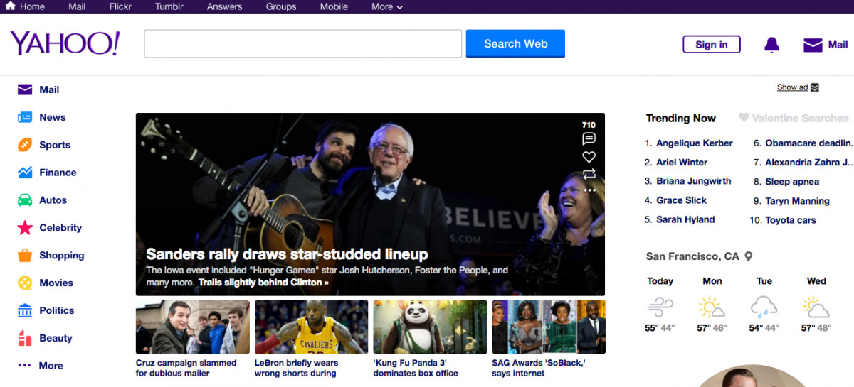 1994年的雅虎网站还没有这么多图片的排版设计,重点也不够突出。对比一下现在的,简直是两个时代。
