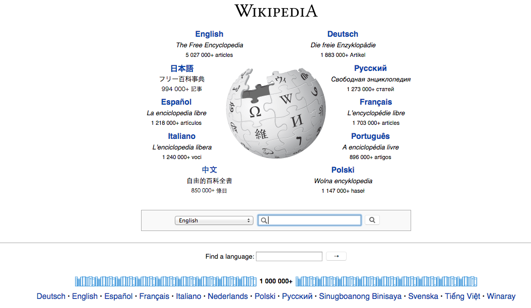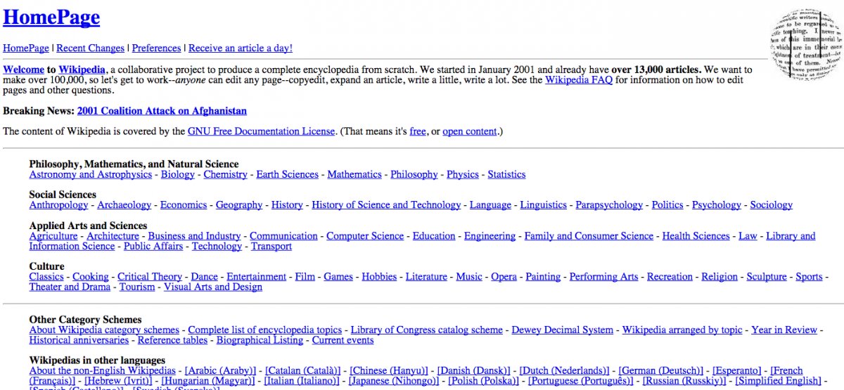 像那个时候的大部分网站一样,2001年的维基百科主页还是堆砌大量超链接的风格,让人找不到重点。现在的网站经过重新设计,变得简洁多了,多种语言的用户入口也更人性化。