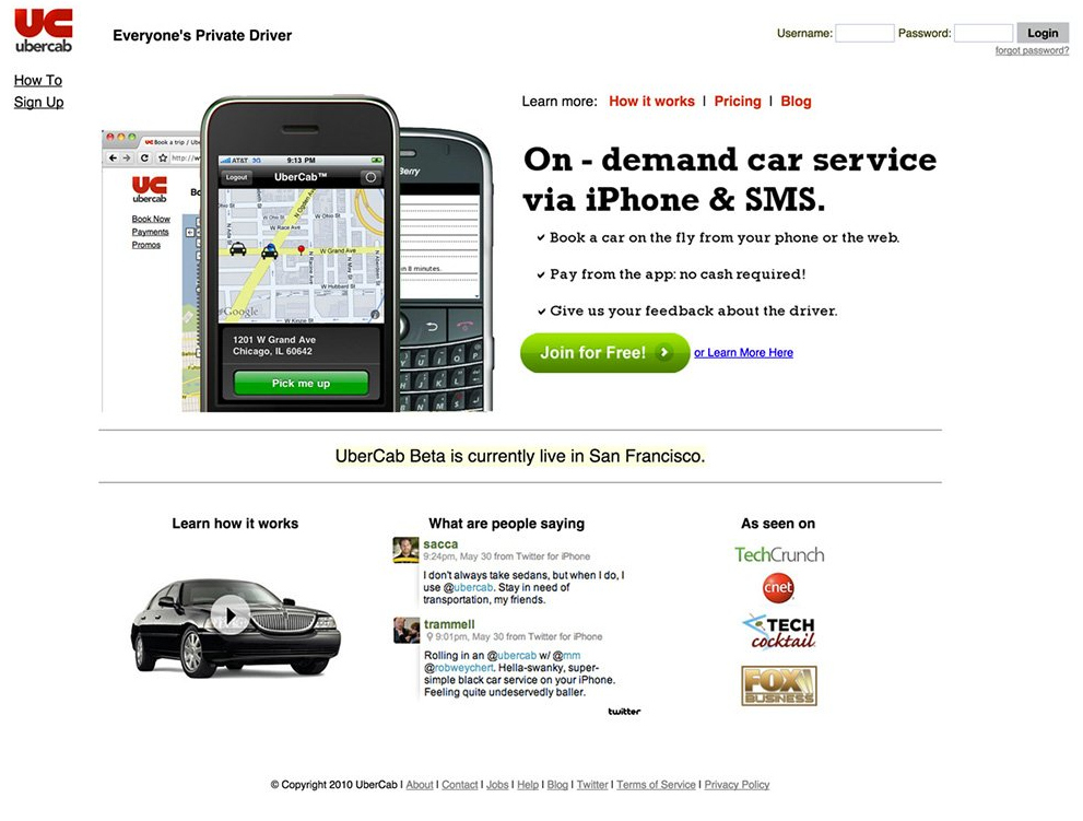 虽然只间隔了6年,但Uber在2010年的网站设计还是看得出和现在有不少差距。随着Uber在全球知名度的提升,其网站的入口也不需要过多的介绍,变得更简洁了。