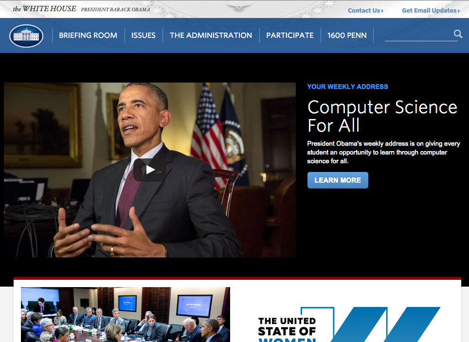 1996年的白宫网站看上去不那么吸引人。现在的设计则用总统的大幅照片做门面,分类导引也清晰了很多。