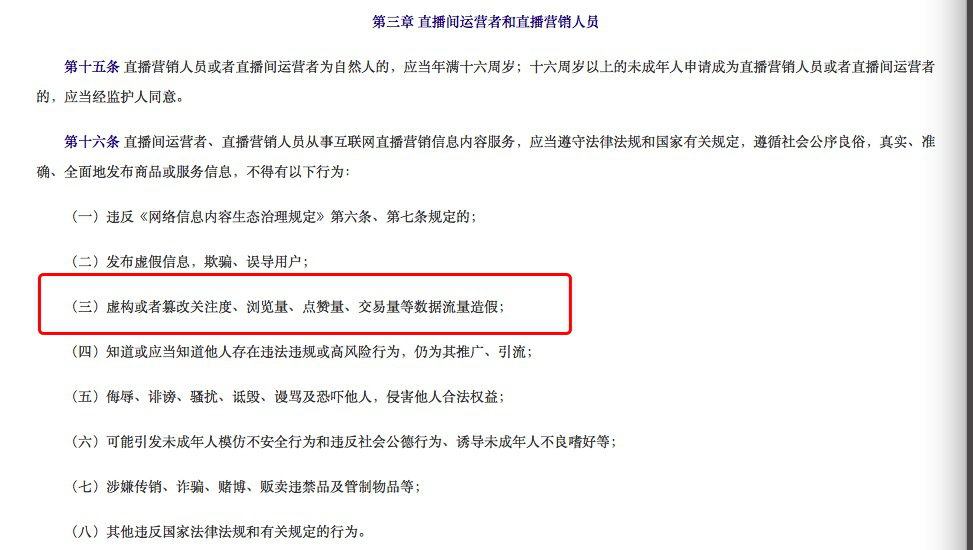 《意见稿》指出,直播间运营者、直播营销人员从事互联网直播营销信息内容服务,不得虚构或者篡改关注度、浏览量、点赞量、交易量等数据流量造假。同时,直播营销平台应当记录、保存直播内容,保存时间不少于六十日,并提供直播内容回看功能。