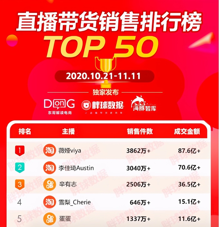 数据显示,双11超30个淘宝直播间成交额破亿元,薇娅、李佳琦、辛巴等头部主播则在双11期间(10.21-11.11)分别创下了87.6亿、70.6亿和36.5亿的成交金额……如此也就不难理解越来越多的明星、企业家、素人挤破脑袋也想要在其中分一杯羹了。