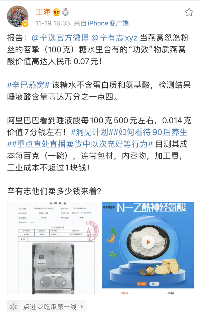 点名、回应,微博上#汪涵李雪琴李佳琦直播被中消协点名#话题阅读量达到5.5亿。无独有偶,就在中消协报告发布的前一天,知名主播辛巴也被“职业打假人”王海爆料,称其售卖的即食燕窝“就是糖水”。不过今天,财经网发布“符合标准”的报道为其正名。