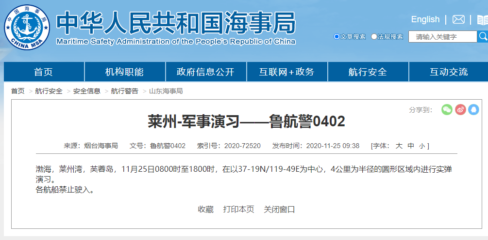 11月25日,中国海事局网站消息,烟台海事局发布《鲁航警0402》,渤海,莱州湾,芙蓉岛,11月25日08:00时至18:00时,在以37-19N/119-49E为中心,4公里为半径的圆形区域内进行实弹演习。