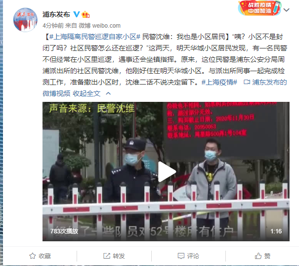 11月25日,据@浦东发布 消息,这两天,明天华城小区居民发现,有一名民警不但经常在小区里巡逻,遇事还会坐镇指挥。有居民对此表示疑惑,“小区不是封闭了吗?社区民警怎么还在巡逻?”@浦东发布 表示,这位民警是浦东公安分局周浦派出所的社区民警沈维,他刚好住在明天华城小区。与派出所同事一起完成检测工作,准备撤出小区时,沈维二话不说决定留下。