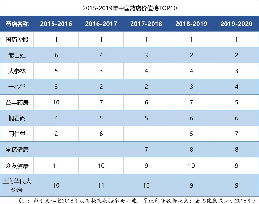 2014-2017年,4大连锁药房接连上市。在最新的榜单中,除了国大药房仍然位居榜首以外,桐君阁、同仁堂已经被挤出前五,成大方圆甚至已经跌出前10,4大民营连锁药房已经完全占据TOP5的其余席位。
