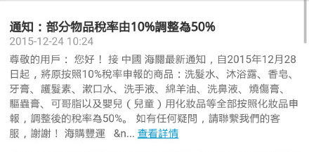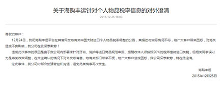 2015年年底,某知名速递速递公司一则通知吓到网友,显示海外购物税率申报由10%上涨到50%,随即第二天就贴出通知澄清,无论是真乌龙还是假涨税,都给我们无限的遐想。