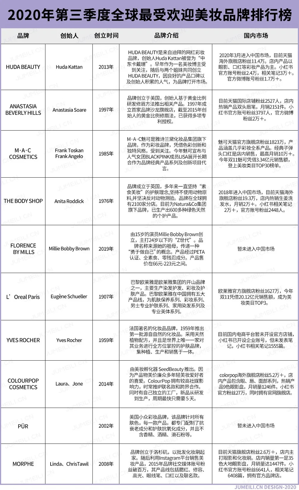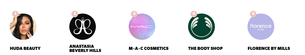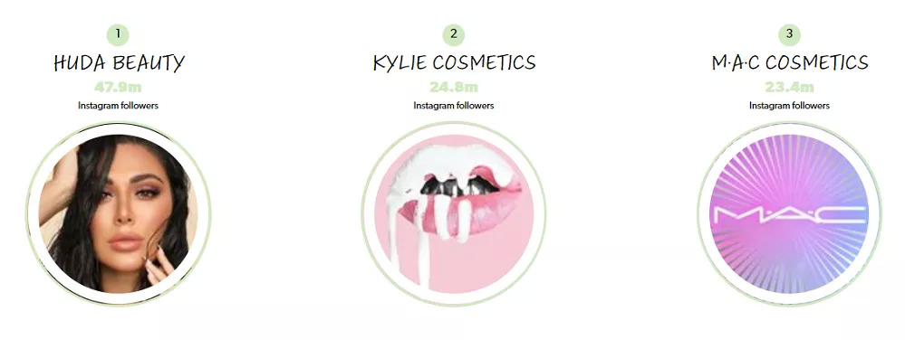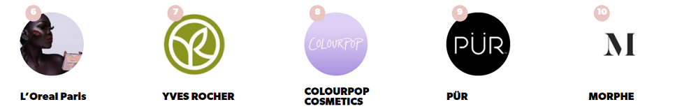 今年7月聚美丽也针对该榜单第一季度报告,进行相关分析。前三位Huda Beauty、Anastasia Beverly Hills和MAC(魅可)依然没有改变,而在前10排名中也出现了The Body Shop(美体小铺)、L’Oreal Paris(巴黎欧莱雅)、PüR这样的新面孔。