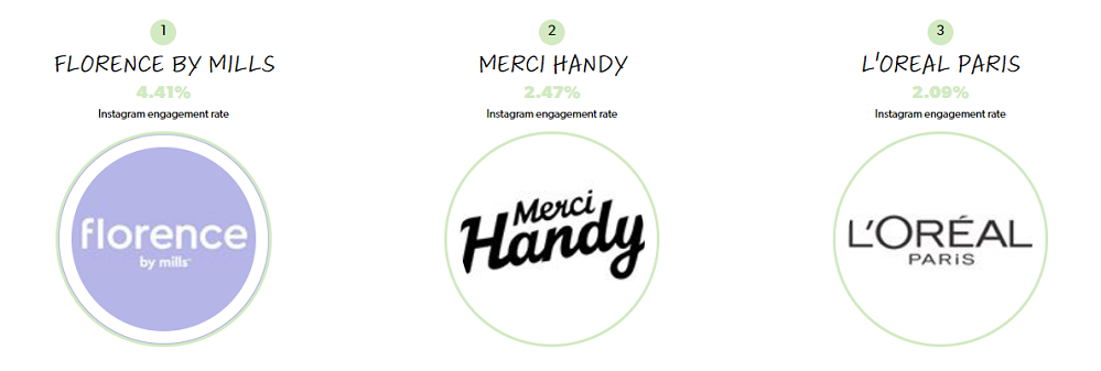 在粉丝参与度排名中发现,Florence by Mills依然排名第一,虽然随着时间的流逝,品牌初期时的炒作热度下降,但该品牌依然以4.41%的参与度排在第一。不过对于一个Instagram粉丝200万的品牌来说,这样的参与度还是令人印象深刻的。