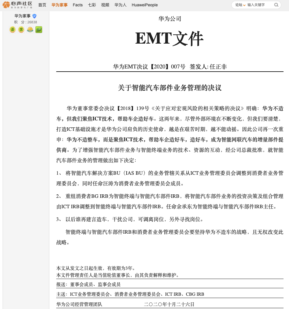 11月25日,华为内部网站心声社区刊发华为智能汽车部件业务管理的决议。华为将智能汽车解决方案BU(IAS BU)的业务管辖关系从ICT业务管理委员会调整到消费者业务管理委员会,同时任命汪涛为消费者业务管理委员会成员。