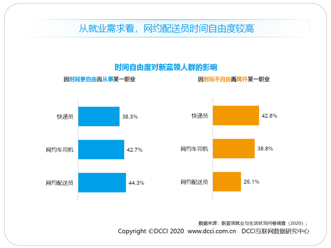 - 外卖骑手在工时安排上更为灵活,则是其在新蓝领岗位中吃香的另外一个主要因素。调研数据显示,有44.3%的人群因为时间自由度高而选择了外卖骑手的岗位,与之相对的,则有超过四成的快递小哥因为时间不自由而离职。