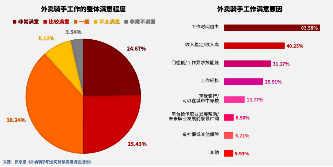 工作时间自由、收入稳定则是最让外卖骑手满意的因素。外卖骑手这个职业对他们来说,不仅是稳定的收入来源,更是他们融入城市,打开、提升职业道路的通道,使他们在异乡的漂泊城市中立足,获得别人的肯定和认可,共同为社会添砖增瓦。