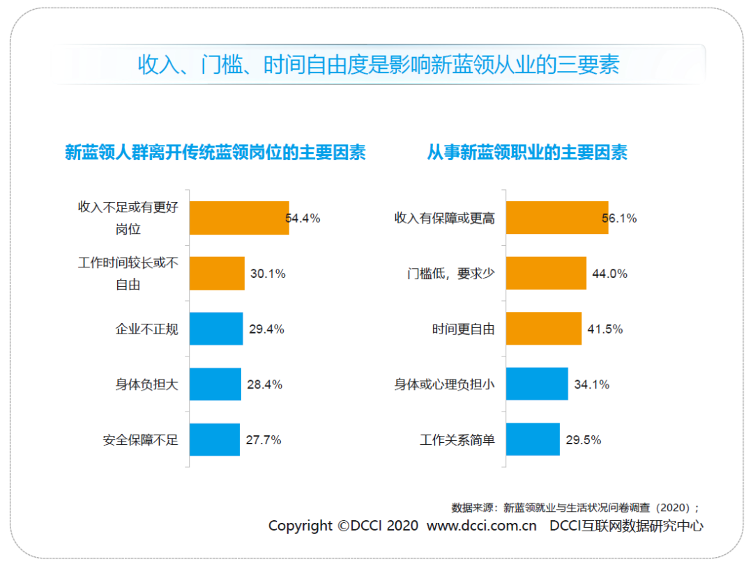 - 外卖骑手拥有比快递小哥更高的收入水平。DCCI数据显示,有40.3%外卖骑手月收入超过了代表较高收入水平的9000元,而快递小哥中达到此收入水平的比例为38.3%——更高的收入,是外卖骑手在新蓝领中更受欢迎的一大原因。事实上,DCCI调研的结果也显示有超过一成的外卖骑手有过当快递小哥的从业经历。