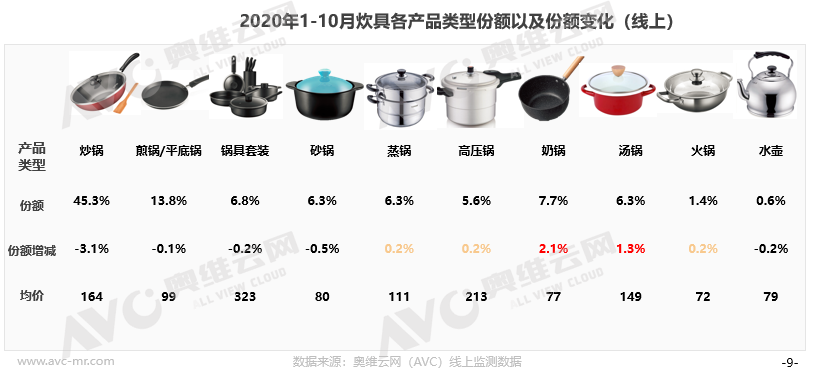 伴随着客厅经济向厨房经济转移,炊具行业迎来高速增长期,据奥维云网(AVC)线上监测数据显示,炊具2020年1-10月线上零售额为67.3亿元,同比增长48%,零售量5173万台,同比增长49%,均价为130元,同比下滑1%。探究背后原因,其一是消费升级大势所趋,消费者逐渐向高品质高性能产品倾斜,另一方面,厨房在日常生活中的角色逐渐由功能型向社交型转变,人们逐渐将目光转移到厨房中来,由此也带动炊具行业的上涨。