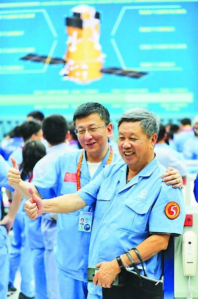 航天科技人员在文昌航天发射场庆祝发射成功。
