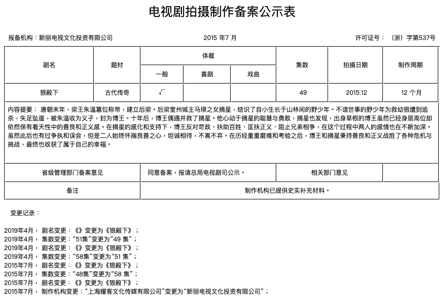 2015年备案后,《狼殿下》在审查上也并非一帆风顺。从广电总局公布的信息看,该剧从原本的48集变为58集,随后删减为51集,再到现在的播出的49集。