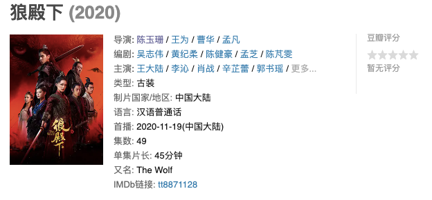 截至25日下午,《狼殿下》的豆瓣评分依然未出。截至11月25日,豆瓣上标记看过《狼殿下》的人数高达14.5万,标记在看的人数为4.6万,整体打分人数超过19万。