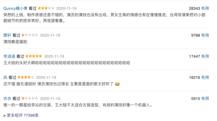 但从19日该剧播出伊始,评论区就大量涌现1星和5星的评价,豆瓣评论区俨然成了粉黑两方势力比拼的赛场,因此尽管该剧目前的豆瓣打分人数已经远超同期其他剧集,但其最终的评分显然不具备参考价值。
