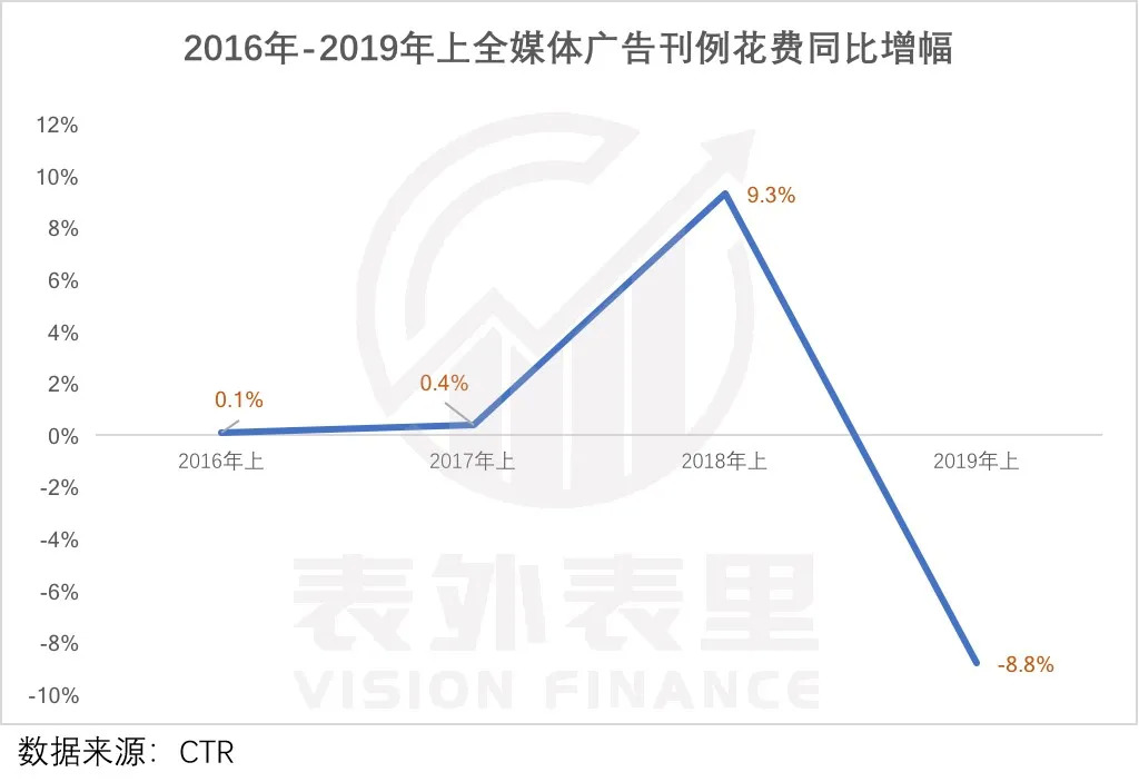 例如 2019年上半年,受行业寒冬影响,中国广告市场按刊例价整体下滑8.8%。