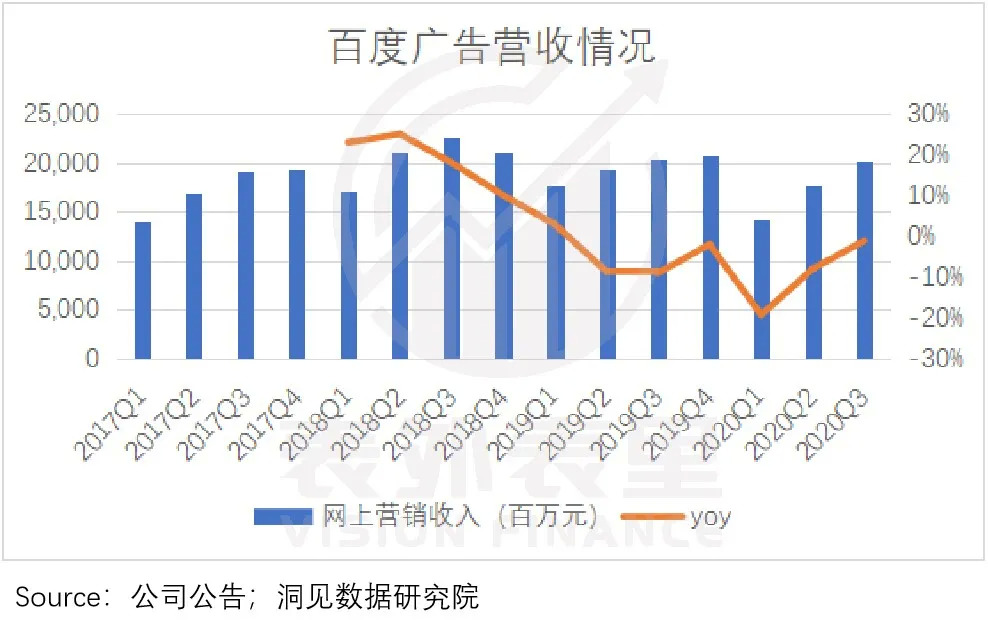 百度的增速情况也和行业整体一致。2019Q3广告业务增速开始触底反弹,在跨过疫情的冲击后,2020年Q3核心在线广告收入增速继续延续上一季度的反弹迹象,改善速度也超出市场预期。