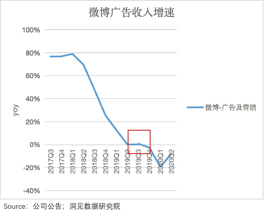 但也不是所有企业都能在行业复苏下受益。比如,2019年下半年,微博在行业增速整体拐头的背景下,Q4季度反而出现下降。