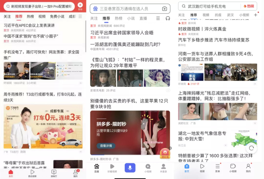 从左到右依次为:今日头条、百度、UC浏览器的APP页面。如果隐去logo标志,很容易傻傻分不清。