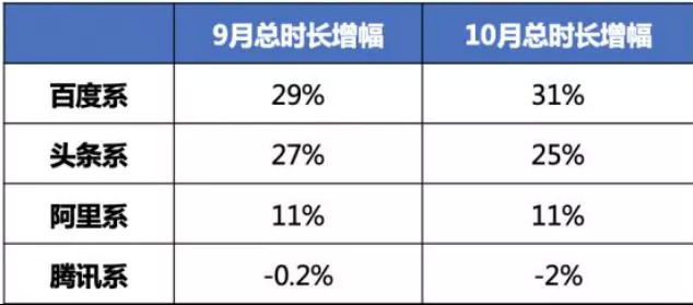 而且QuseMobile报告显示,去年9至10月期间百度移动产品(包含百度App、好看视频、全民小视频、百度网盘等)用户总时长分别同比增长29%、31%,增速领先于头条系、阿里系和腾讯系。