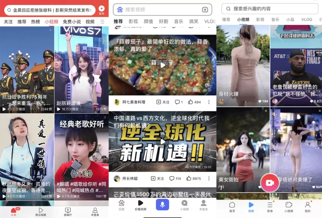 从左到右依次是今日头条、UC、百度的视频页面。
