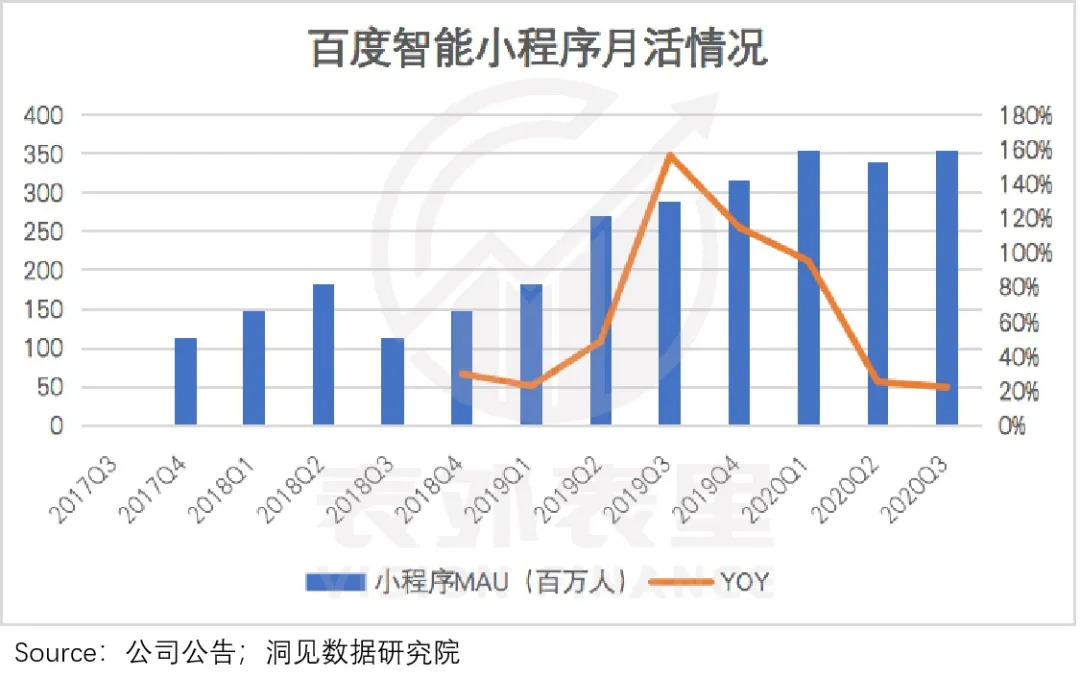 百度从17年Q4起开始发力小程序,仅三年时间,百度智能小程序2020Q3平均MAU达3.55亿。