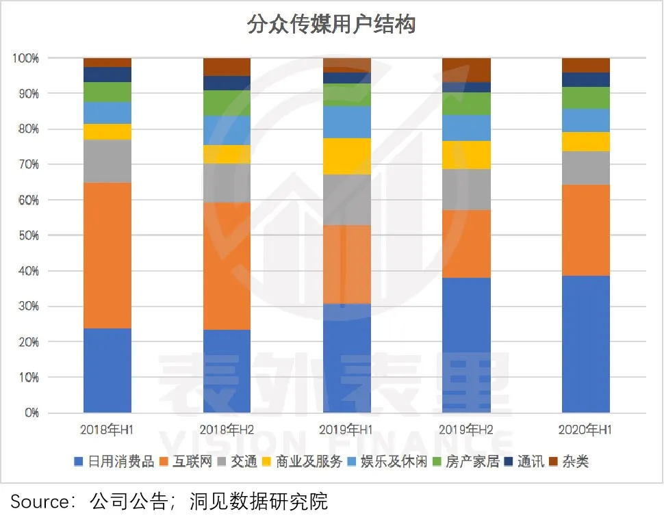 从2018年到2020H1,分众传媒的客户结构占比始终在变动中。其中,刚需特性的日用消费品客户占比不断提升,易受经济波动影响的互联网企业客户占比有所下滑。