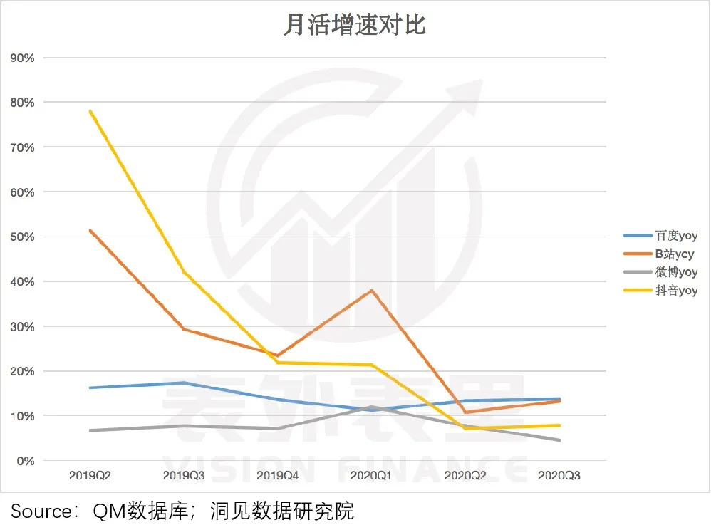2020Q2,B站、微博、抖音月活用户规模的同比增速,均较2020Q1出现放缓情况,Q3微博、抖音月活增速继续下滑,B站增速有所回升。