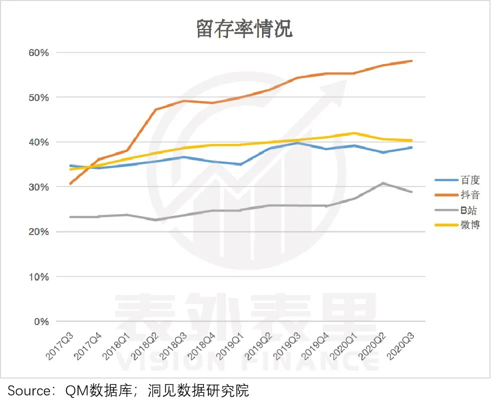 从2017Q3~2020Q3,百度、微博、快手、知乎的留存率趋势变化看,和疫情相关性不大。