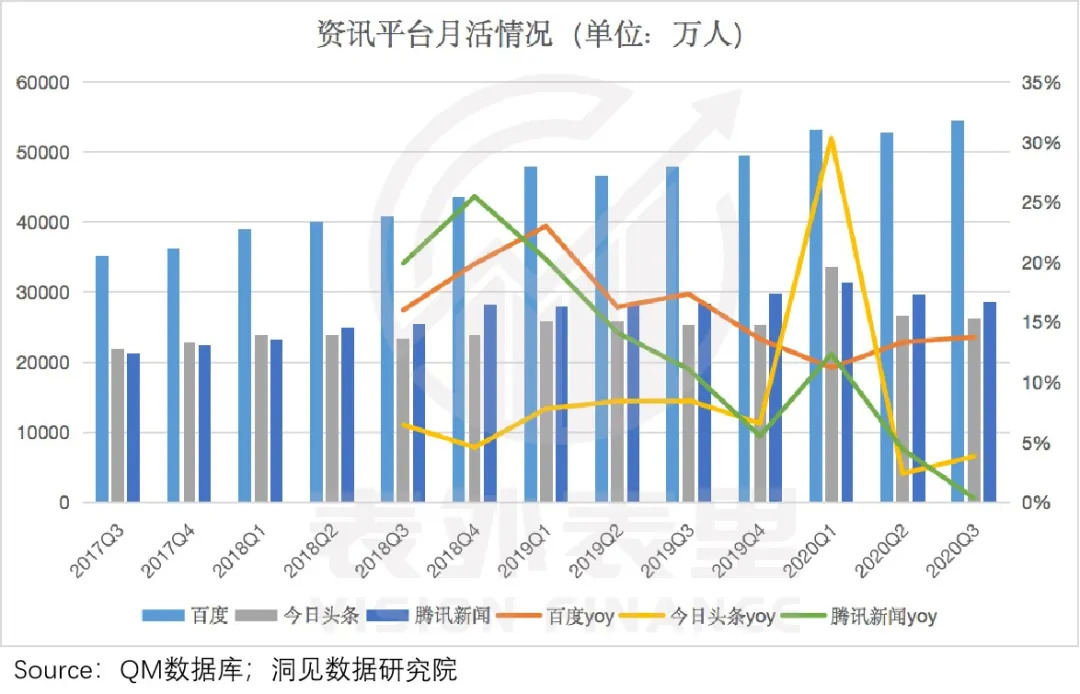 根据QM数据,2020Q3,百度APPMAU均值达5.4亿,同比增长14%;今日头条APPMAU均值2.6亿,同比增长4%;腾讯新闻MAU均值2.8亿,与去年持平,基本零增长。