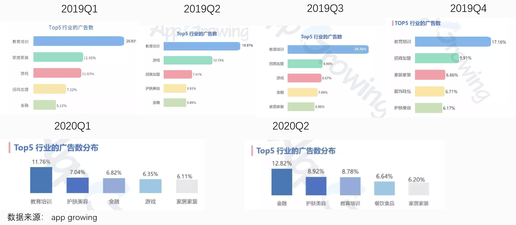 TOP5行业已经连续6个季度没有医疗广告;金融行业广告占比在TOP5的排行一直在降低,2019Q4从TOP5排行中退出(2020Q1、Q2金融行业广告再次占比较重,推测是受蚂蚁集团、京东金融、陆金所等金融科技企业寻求上市,大规模投放的影响)。
