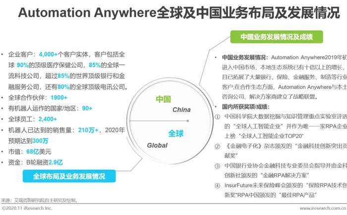 Automation Anywhere是RPA行业的全球领导者,开创了智能数字化劳动力的概念,并提供了基于云端的数字化劳动力平台,结合复杂的机器人流程自动化、人工智能驱动机器人和嵌入式分析,该云平台自从2019年年末发布以来,累计用户已超20万。Automation Anywhere的产品还包括企业级版本EnterpriseRPA、流程发现解决方案Discovery Bot、集成AI能力的IQBot、定位在智能分析的Bot Insight、人机协作交互方案HBC,以及业界第一个机器人商店和机器人移动应用等。