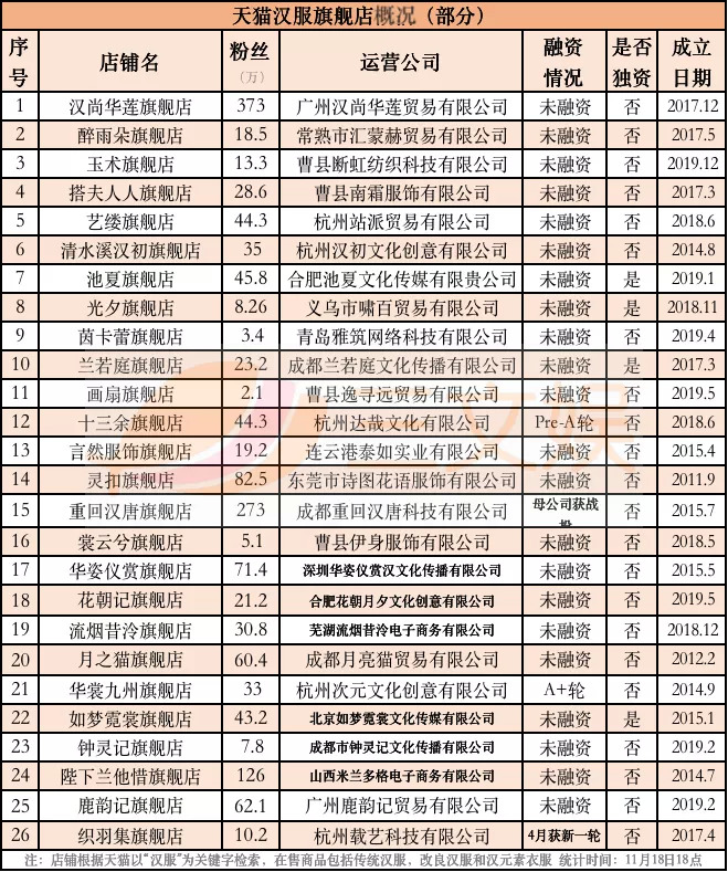 在天猫拥有不错粉丝量的26家汉服店,只有4家背后有外来资本助力