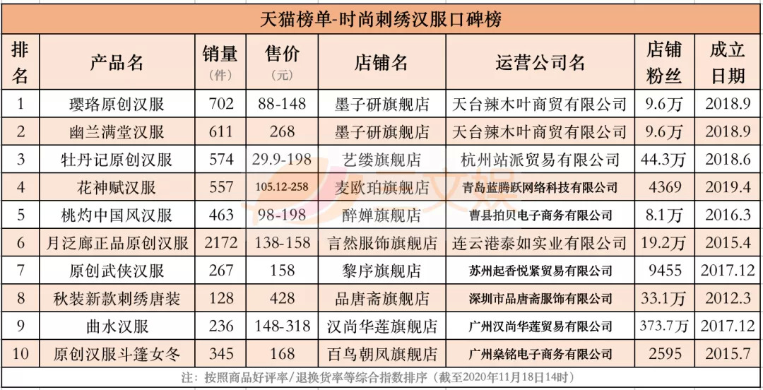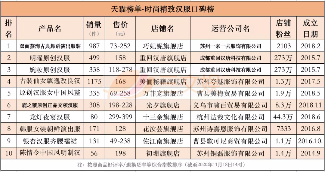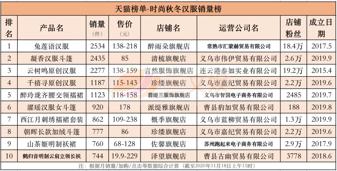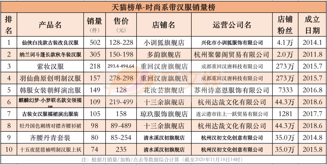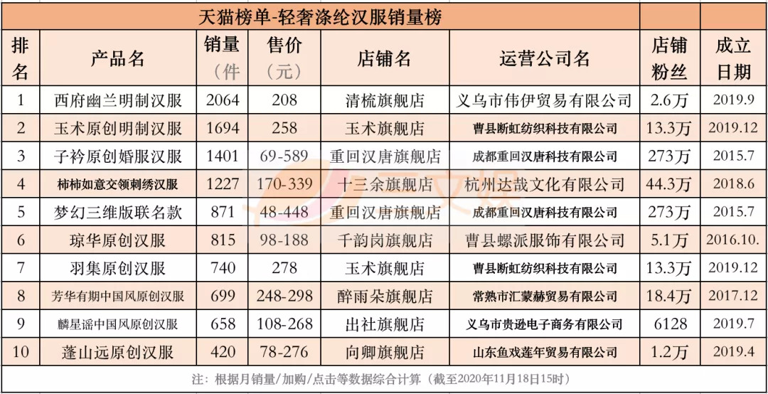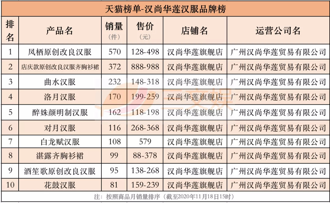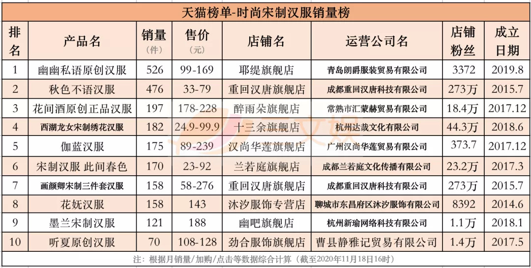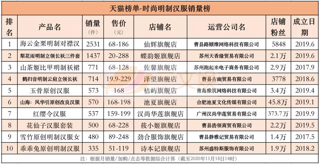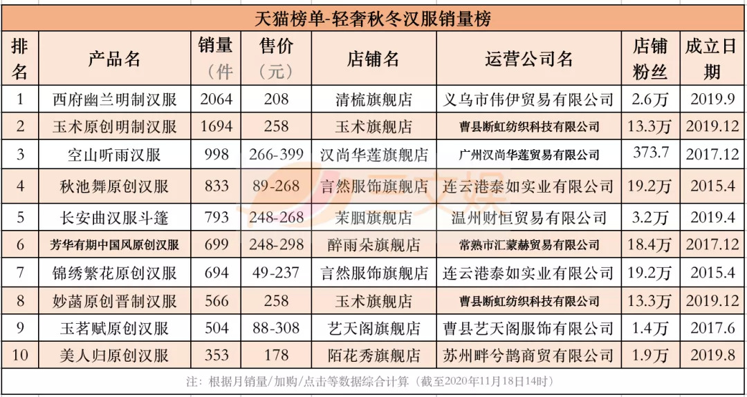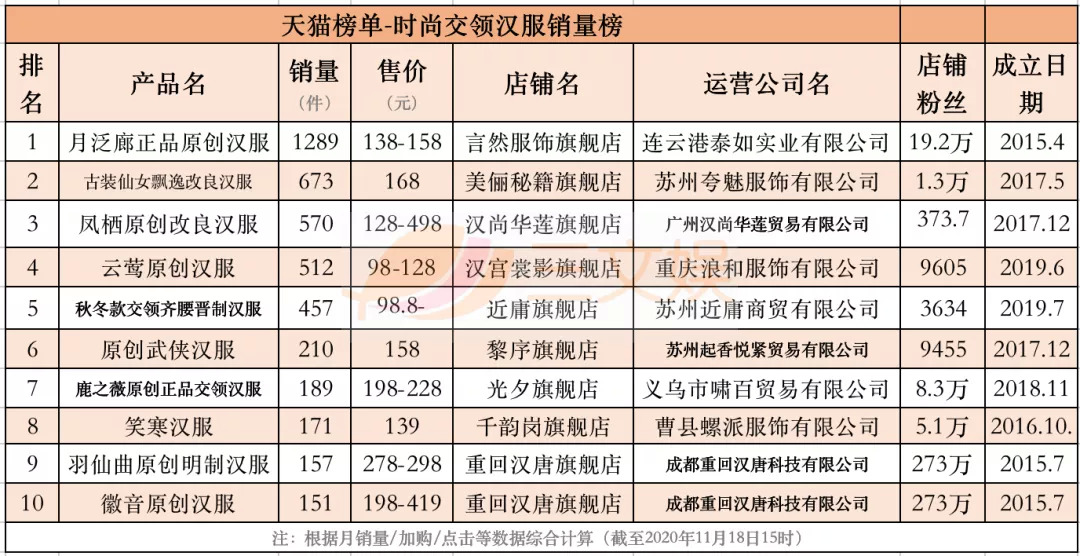 11月18日,三文娱统计了天猫榜单关于时尚秋冬汉服、时尚明制汉服、时尚系带汉服、时尚交领汉服、时尚宋制汉服、时尚汉元素汉服、轻奢秋冬汉服、奢涤纶汉服的8个销量榜,时尚刺绣汉服、时尚精致汉服的2个口碑榜,以及汉尚华莲汉服品牌榜,共11个榜单的Top10的汉服产品。