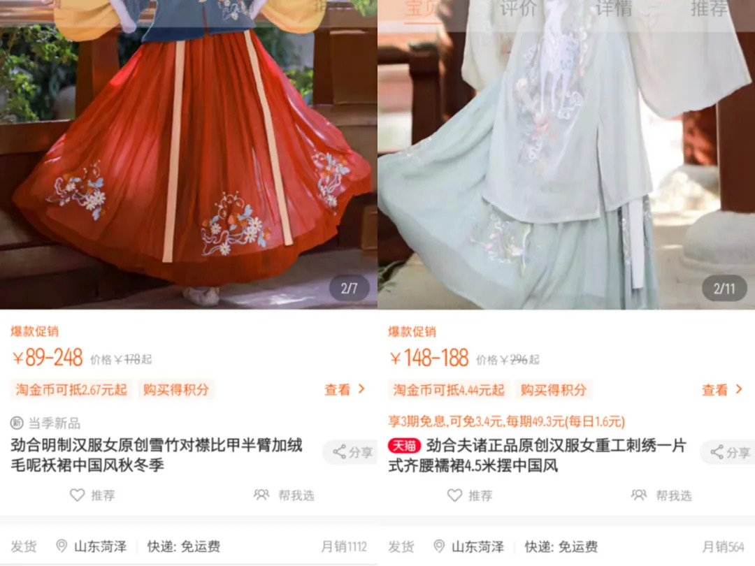 目前,劲合服饰旗舰店有粉丝1.4万,店内商品中,雪竹对襟比甲袄裙价格89-248元,月销售量1112件。此外鹊桥仙、夫诸原创汉服月销售量也超过500件。
