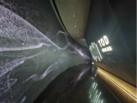而互动环幕四面屏、巨幅弧面屏则体现出科技与人类和谐的互动。当你靠近屏幕时,智能化的感应系统,会感应到人的存在,流光溢彩的画面在‘急’与‘缓’之间随意切换。