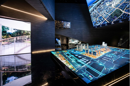 动态的沙盘、区位显示屏,也是科技感十足。未来,楼盘周边的每条道路、配套情况、城市界面,都形象生动地展示出来。