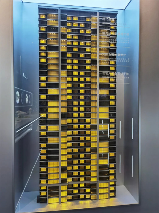 在工法示范区,我还看到住宅大门为全石材干挂,两层通高的体量一方面加强了大堂的通透性与尺度感,另一方面采光也更优。