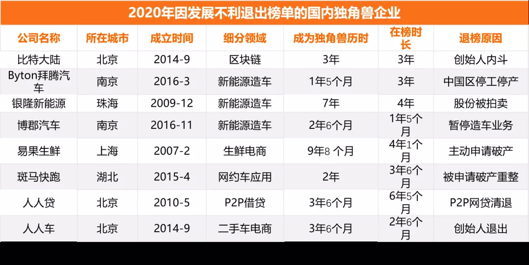 这样的企业可能也不少,根据 IT 桔子观察,2020 年就有 8 家曾经的独角兽企业已经面临估值跌落、经营困难、甚至被申请破产、濒临倒闭的风险,包括拜腾汽车、博郡汽车、人人车、易果生鲜等。