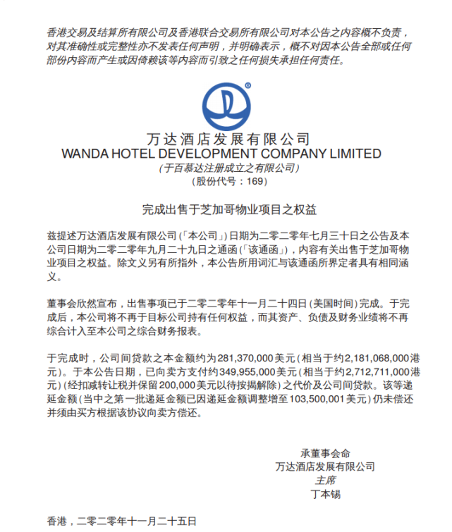 11月25日晚间,万达酒店发展公告,美国时间11月24日,公司完成出售芝加哥物业项目。公司将不再持有目标公司任何权益,目标公司的资产、负债及财务业绩将不再综合计入公司的综合财务报表。